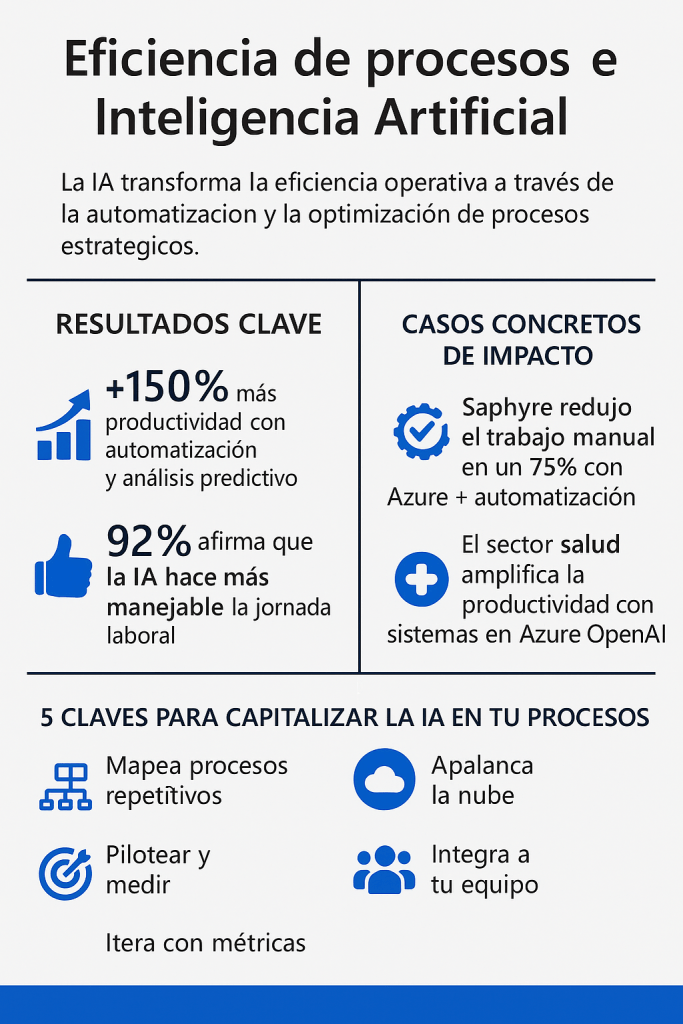Según el blog “Enhancing efficiency with AI automation and insights”, organizaciones que adoptan IA para optimizar procesos logran hasta un 150 % más de productividad, gracias a la automatización y el análisis predictivo